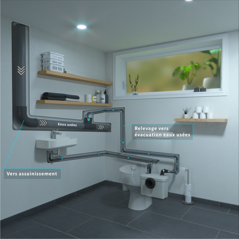 - Si la pente d’écoulement est négative car la colonne des eaux-vannes est au-dessus de votre WC. (A la cave ou au sous sol par exemple).